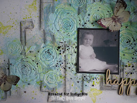 Once the paste was dry I started to build up the colour by spritzing/splattering diluted Kingfisher Blue making sure the Roses were coloured. I then did the same with the yummy Lime Marmalade Cottage Garden Paint and added some Butterflies from the Floral Fantasy Stamp Set stamped out in paint.