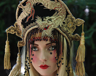 My inspiration for this project was this image of a Chinese Empress' Headdress. I decided to collage a children's hardboard book. Having painted it with gesso I stamped the Jane image into the centre, then added texture paste through the Damaged Damask stencil around it. I began to build up odd embellishments to form a headdress then stamped the same Jane image onto card and layered it over the first. I continued to add more embellishments to the headdress until I was happy with it.